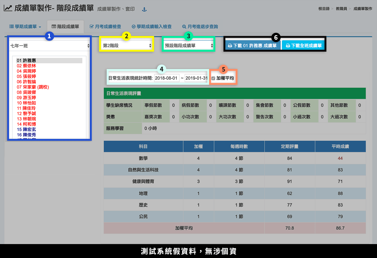 下載該生或全班成績單。
